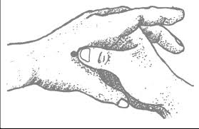 - Altra tecnica: stringere con forza pollice ed indice distesi, fra le due dita si forma un piccolo monticello (è il muscolo adduttore del pollice), il punto si trova contro l’osso (metacarpo) in corrispondenza della cresta del muscoletto .