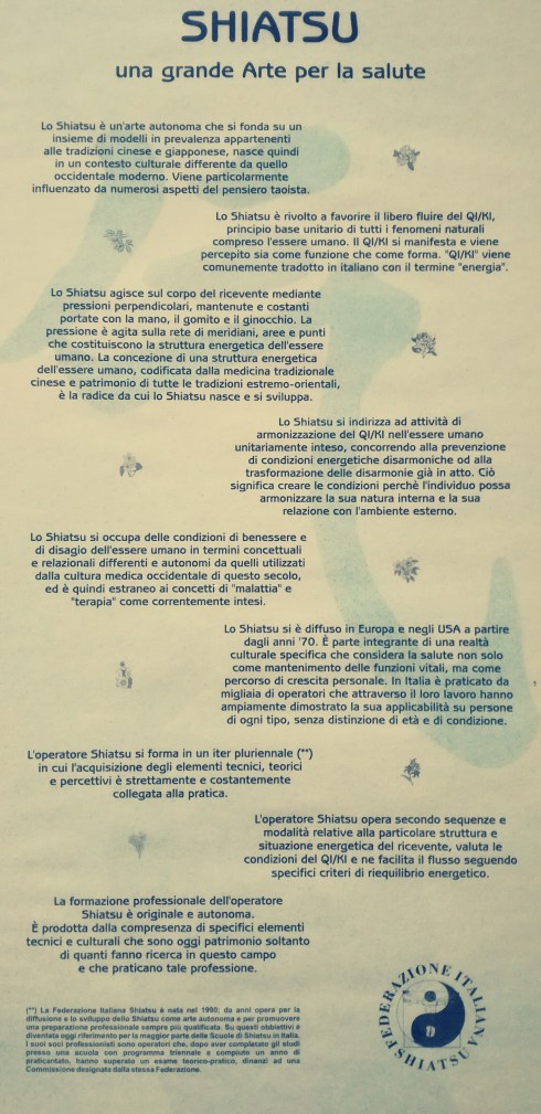 (*) La Federazione Italiana Shiatsu è nata nel 1990. Da anni opera per la diffusione e lo sviluppo dello Shiatsu come arte autonoma e per promuovere una preparazione professionale sempre più qualificata; su questi obiettivi è diventata oggi riferimento per la maggior parte delle scuole di Shiatsu in Italia. I suoi soci professionisti sono operatori che, dopo aver completato gli studi presso una scuola con un programma triennale e compiuto un anno di praticantato, hanno superato un esame teorico-pratico dinanzi ad una Commissione designata dalla stessa.