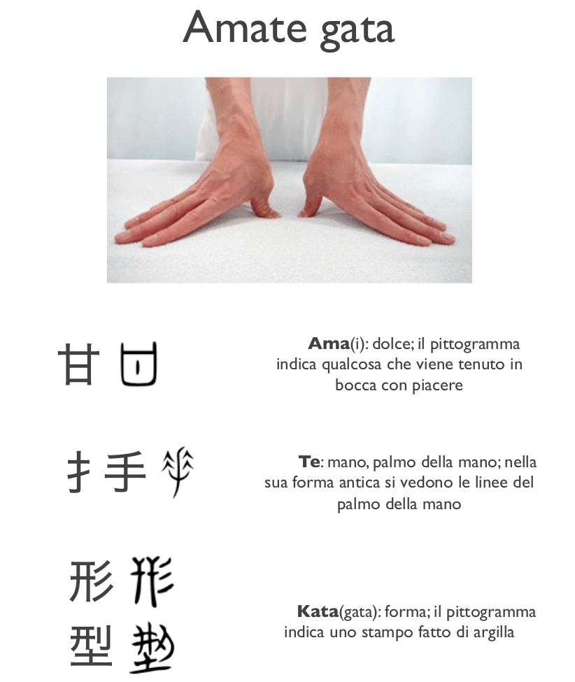 Nella tradizione giapponese di distinguono due tipi di mano: “amate” (甘手) e “karate” (辛手 o “nigate” 苦手), “dolce” e “amara”. Entrambe sono necessarie: la mano che deve fare una puntura deve essere “karate”, professionale, tecnica, decisa, rapida, efficace e precisa, ma non fredda, frettolosa, dura o insensibile (il termine che identifica l’arte marziale del karate 空手 significa “mano vuota” ed è diverso anche se omofono); la mano che vuole rassicurare deve essere “amate”, dolce, calda, rassicurante, morbida, amorevole ed avvolgente, ma non molle, falsa, debole o assente.